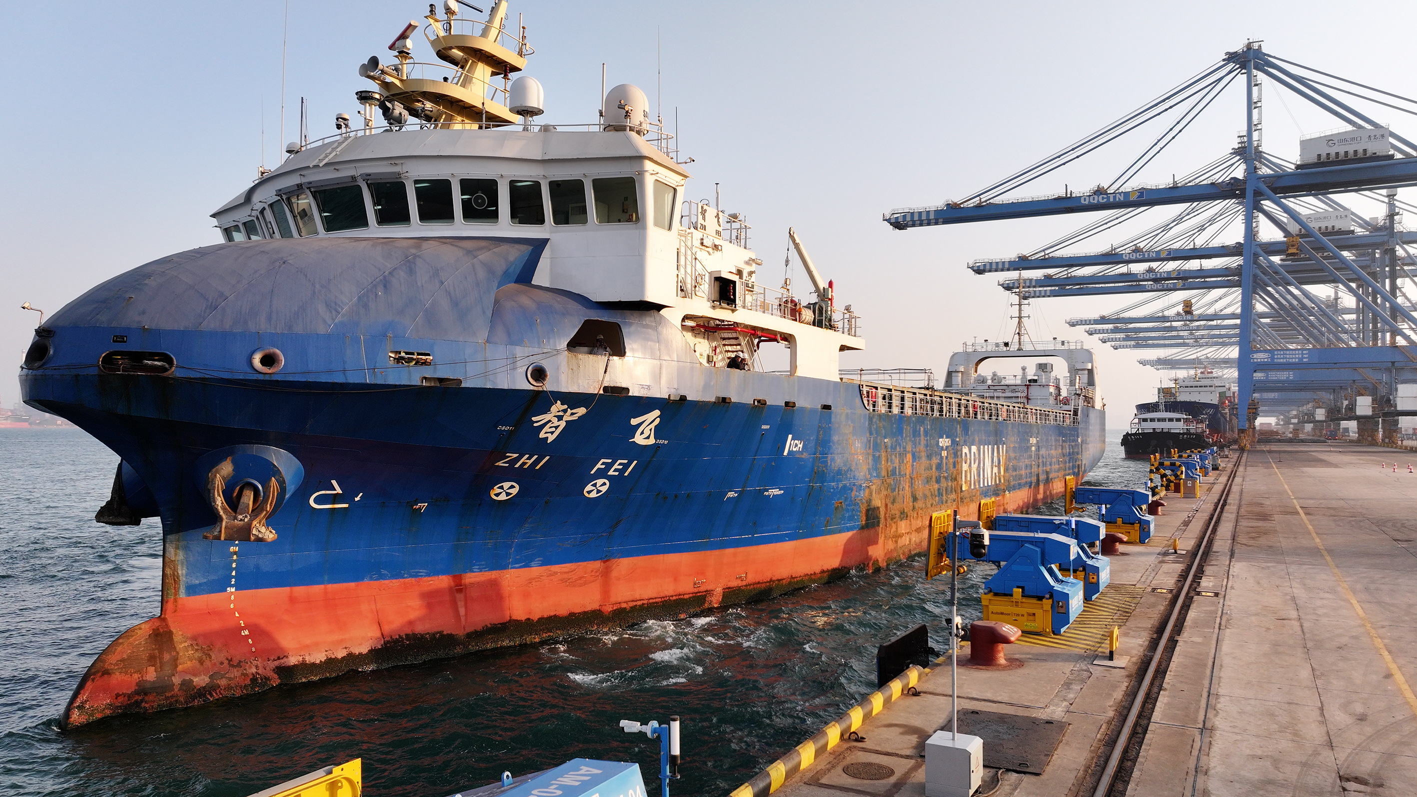 作为山东海事部门交通强国建设试点任务的核心成果,“智飞”号搭载国内自主研发的智能航行核心系统,是世界最早具备自主航行能力的船舶之一,也是国内首艘面向商业运营的智能运输货船,具备人工驾驶、远程遥控、无人自主航行三种模式。此次驶入青岛港自动化码头,采用无人自主航行模式,船舶自动精准规划航行线路,稳稳进入泊位区域。